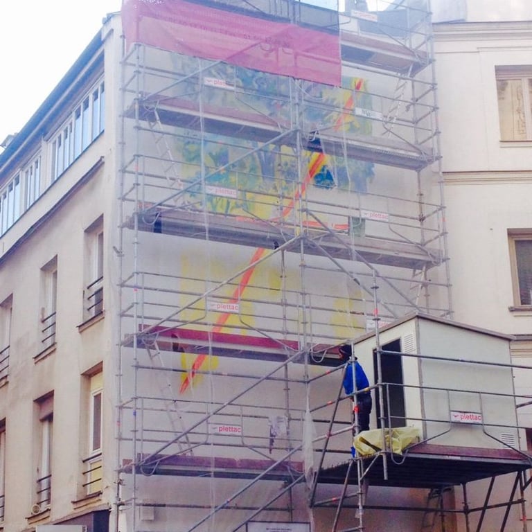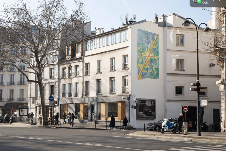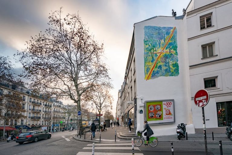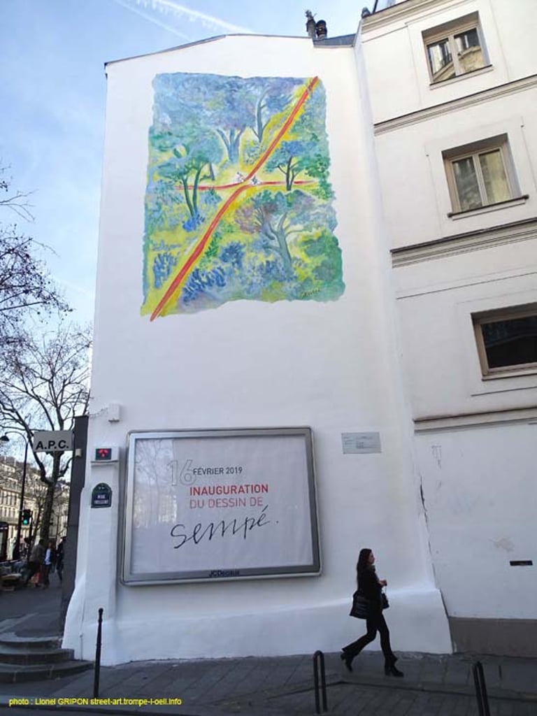 Fresque en Hommage au célèbre dessinateur JJ SEMPE. Reproduction d'une de ses emblématiques aquarelles. Réalisée en 2018 et inaugurée en 2019 par la Mairie de Paris, financée par JCDecaux.